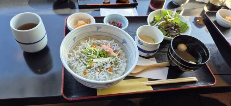 このしらす丼は、地元の漁港で朝に水揚げされた新鮮なしらすを使っているのが特徴で、素材の旨みがそのまま感じられます。ご飯との相性も抜群で、醤油や薬味を少し加えることで味の変化も楽しめました。添えられていた味噌汁には地元のわかめや豆腐が入り、ほっと一息つけるようなやさしい味わい。